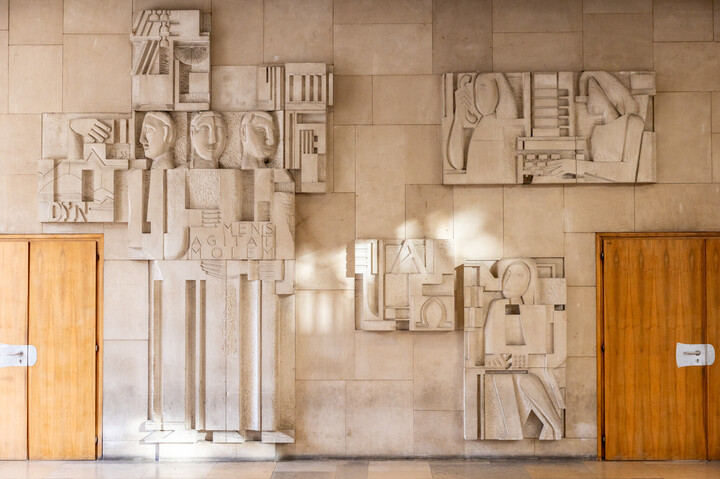 Die raumgreifende Arbeit im Treppenhaus vor dem Lautenschläger- und Röchling-Hörsaal besteht aus drei Reliefelementen, die sich in Größe und Form unterscheiden, jedoch gestalterisch eng verbunden sind. Dargestellt sind abstrahierte Figurenpaare in sitzenden und stehenden Haltungen, deren Beziehungen bewusst offen bleiben. Die plastische Ausarbeitung erzeugt markante Licht- und Schatteneffekte und verleiht der Arbeit eine dynamische, erzählerische Wirkung.