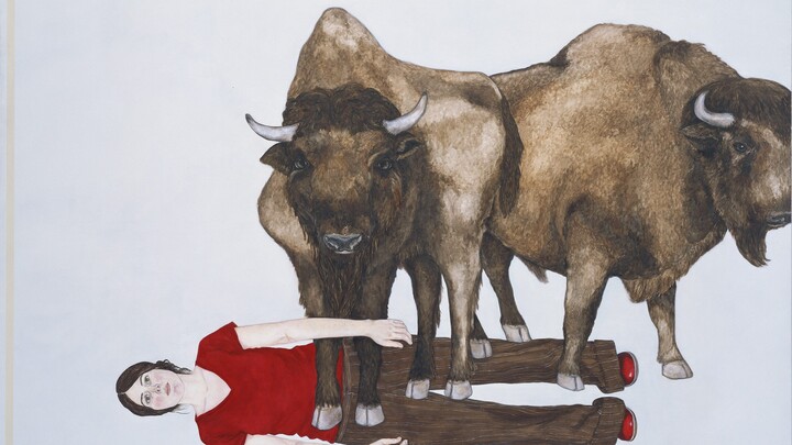 Donna Stolz (geb. 1977 in Taunton, England) zeigte lebensgroße, naturalistische Figuren in Öl auf Leinwand, häufig Selbstporträts, vor reduzierten, atmosphärischen Hintergründen mit offenem Deutungsspielraum.