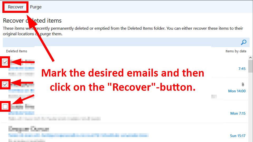 - Select the e-mails you want to recover in the list, by checking the box.