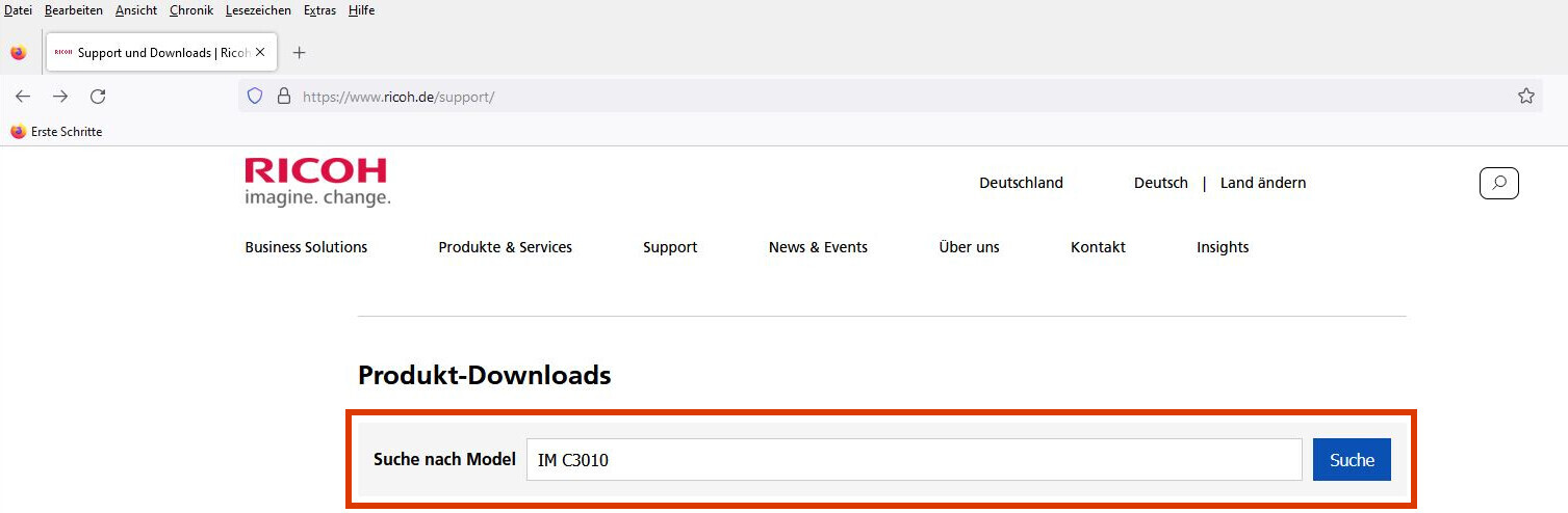 Bitte rufen Sie folgende Website auf: https://www.ricoh.de/support/ und geben Sie ins Suchfeld Ihr Kopierermodell ein, z. B. „IM C3010“.